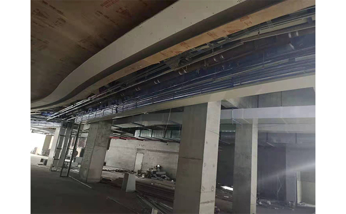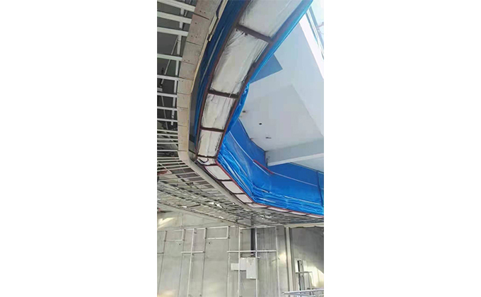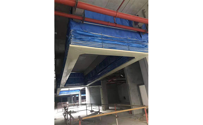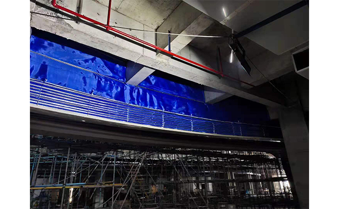 擋煙垂簾垂壁根據(jù)設(shè)計(jì)要求和現(xiàn)場實(shí)際情況采取如下施工順序:首先,搭設(shè)腳手架一放線一打眼--上脹栓一焊骨架。第二,吊件一安裝骨架…